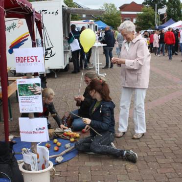 Wir von der Kunstschule Zinnober haben gemeinsam mit unseren Kolleg*innen der Kunstschule Lingen in zwei bereits existierende öffentliche Feste jeweils ein Erdfest integriert: einmal am 23. Juni in das Internationale Fest in Papenburg, an dem wir uns seit 25 Jahren beteiligen und tags darauf in das Welt-Kindertheater-Fest in Lingen. Zuvor hatten unsere Kunstschulen zwei Jahre lang in einem »ÄPfEL« genannten Programm künstlerisch mit Äpfeln geforscht (ÄPfEL bedeutet hier auch »Ästhetisches Programm für das Emsland«). Den Abschluss dieses Programms mit dem Erdfest zu verbinden war auch ein Aufruf zum Weitermachen.