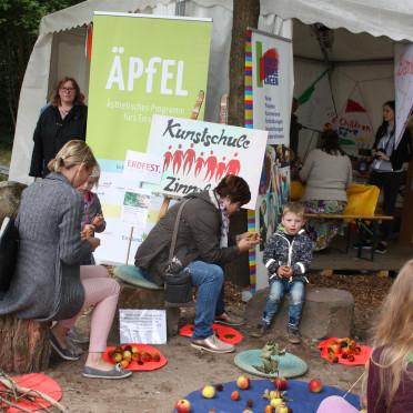 Für unsere Erdfeste in Papenburg und in Lingen wollten wir im Rahmen der beiden oben genannten etablierten Feste Menschen zu einem ästhetischen Prozess und ergebnisoffenen Austausch mit Äpfeln einladen. Als Initiator*innen und verantwortlich Teilnehmende darüber nachzudenken, wie dies in einem solchen öffentlichen Raum mit »unbekannten« Menschen überhaupt geschehen kann, gehörte schon zur eigenen Vorbereitung, sowohl was die Materialien anging als auch die innere Haltung, mit der wir in den Prozess einluden.