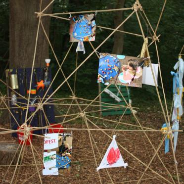 Diese Fotos haben wir laminiert und am nächsten Tag beim Erdfest in Lingen in eine Mitmach-Kunstinstallation aus Bambusstöcken integriert, sodass das Erdfest in Papenburg mit dem beim Welt-Kindertheater-Fest in Lingen verbunden war. Dort konnten wir uns, gemeinsam mit unseren Kolleg*innen von der Kunstschule Lingen auf dem schönen Festivalgelände unter Bäumen ein weiteres Mal auf den von uns initiierten Erdfest-Prozess einlassen.