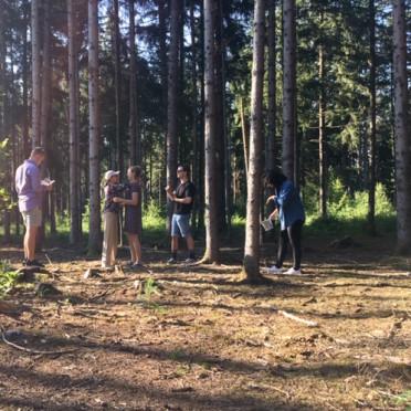 Mit den Rädern in den Wald: Die Stimmung unter den Bäumen. Knackenden Nadeln unter den Füßen. Leuchtende Farben überall. Das ist ein Geschenk an uns alle. Vielleicht war es die Stille, die ein Reh einlud, sich neugierig zu uns zu gesellen – wer weiß. »Es ist so schön zu wissen, dass die Tiere da sind. Wie viele sind wohl gerade um uns herum?«, oder »Was in einem einzigen Stück Baumrinde wohl alles lebt?« Das überlegten wir und hörten dabei den Mitwesen zu. Und dann gab es eine ordentliche Tannenzapfen-Schlacht. Zum Abschluss schmückten wir einen Baumstumpf mit Rosenblättern, die wir vorher aufgesammelt hatten. Mit Herz.
